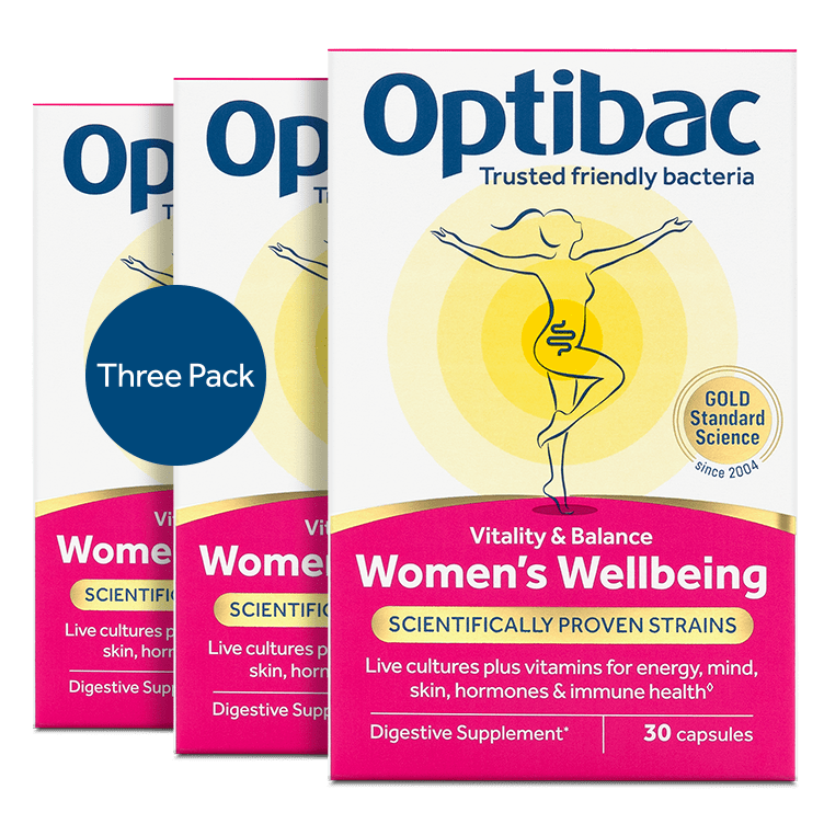 Optibac Probiotics Women's Wellbeing probiotics for gut, hormones, mind and sleep - 90 capsules - front Optibac Probiotics For Women - award winning vaginal probiotics - 90 capsules Optibac Probiotics Pregnancy - award winning pregnancy probiotic - 3 pack